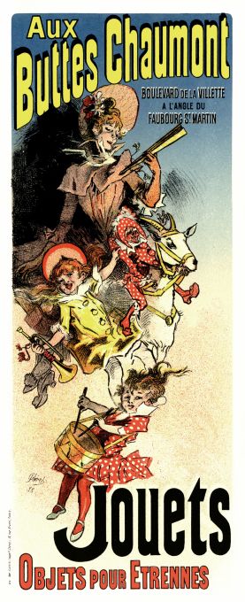 Cheret poster reading At the Buttes-Chaumont [store], boulevard de la Villette at the corner of faubourg St-Martin [, Paris]; toys, New Year's gifts. 1888. - Jules Cheret (French; 1836-1932) Leading lithographer; set up his own shop, specializing in posters, in 1866 (in 1881 this shop became part of the Imprimerie Chaix, publishers of Les Maitres de l'Affice); after selling shop, continued doing commercial graphics, but also painting, tapestry cartoons, etc.; combining rococo grace and modern Parisian elegance, created a true poster style (rather than imitation of oil paintings); first major poster artist to draw directly on lithographic stone.