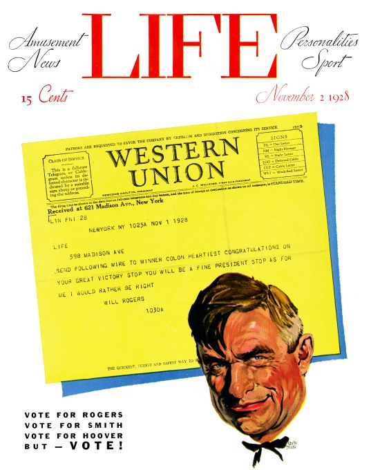 Treidler poster of a Western Union slip with Will Rogers face beside it. Life Magazine cover November 2, 1928.