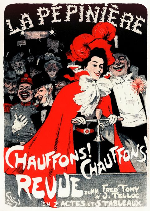 Grun poster reading La Pepiniere [(Tree) Nursery; a theater], Chauffons! Chauffons! [Let's Heat Things Up, probably also with reference to driving a car], a revue by Fred Tomy and J. Telloc, in 2 acts and 5 scenes. 1898. - Jules-Alexandre Grun (French; 1868-1934): Painter, pastelist, magazine illustrator, cabaret decorator; poster style influenced by Vallotton; bold use of black-and-white or two color work (red as a second color).