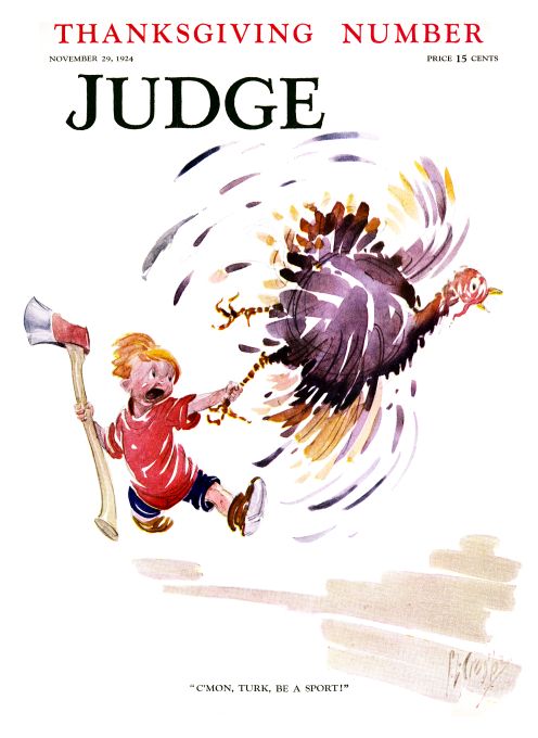 P.L. Crosby poster of a cartoon kid holding an ax, grabbing after a frightened turkey by the leg. Judge Magazine cover November 29, 1924.