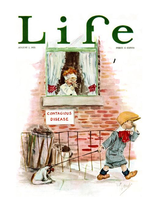 Crosby poster of kid in a hat walking a dog that's not moving, the kid making a "PU" face as another kid stares out the window. Life Magazine cover August 2, 1923.