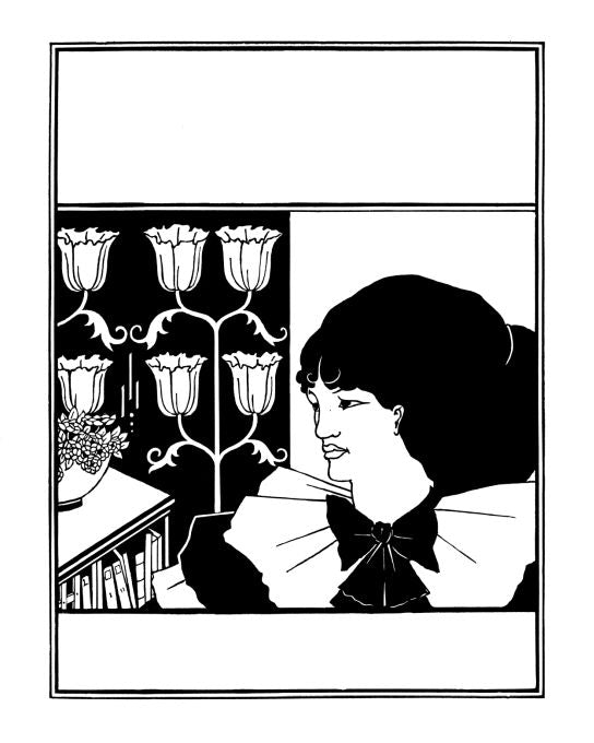 Beardsley illustration a thoughtful looking girl with long dark hair standing by a book shelf with unlit candle lamp behind her. Cover Design for The Yellow Book, Volume 2.