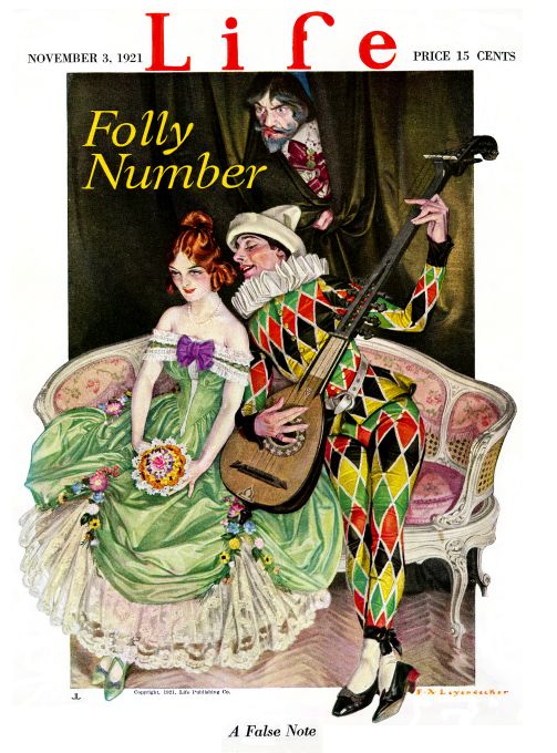 Leyen Decker poster of sexy girl in a green dress leaning up on the couch leaning up on bard in a multi-colored checkered suit as he plays on a lyre. Life Magazine cover November 3, 1921.