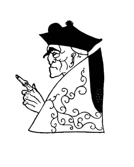 Beardsley illustration of an old Chinese priest in an ornate costume pointing a gnarled finger forward. 1894.