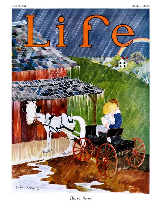John Held poster of a couple sitting on a horse drawn buggy kissing under the rain, a white horse sits under the landing of a house, off in the distance a rainbow falls. Life Magazine cover June 1, 1922.