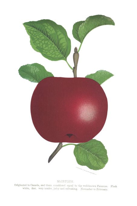 McIntosh. Originated in Canada, and then considered equal to the well-known Fameuse. Flesh white, fine, very tender, juicy and refreshing. November to February.