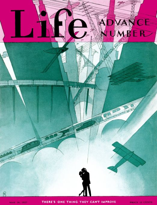 FGC poster of a silhouette couple kissing passionately, behind them is a cloud with planes, trains, skyscrapers, and telephone poles. Life Magazine cover May 26, 1927.