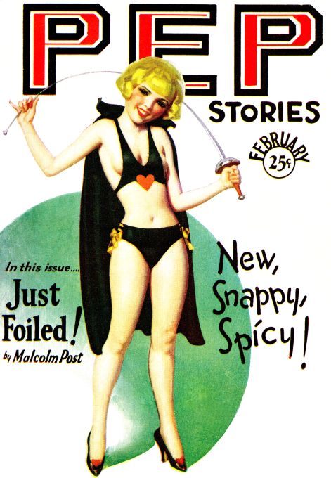 Spunky young blonde girl in skimpy black outfit and cape with fencing sword. Pep Stories Cover February 1930.