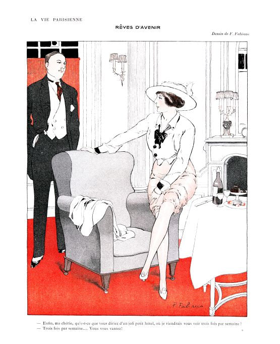Brunette girl sitting on the arm of chair with legs crossed while man stands nearby.