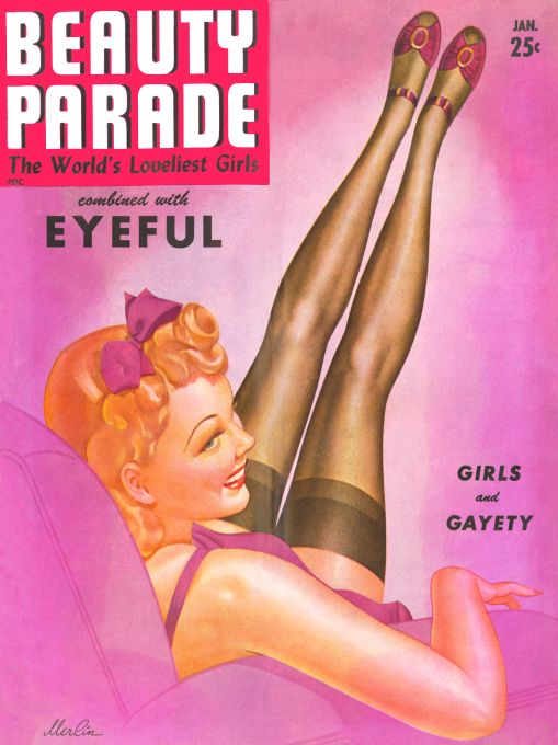 Cheerful blonde from behind while she's sitting in pink easy chair with her legs playfully kicked into air. Beauty Parade Cover January 1944.