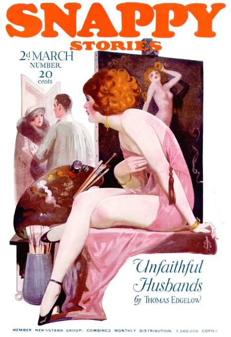 Sensual redhead girl draped in pink hiding behind nude painting of herself while lover distracts his wife. Snappy Stories Cover March 1924.