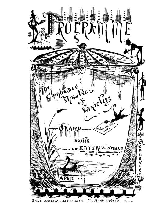 Beardsley illustration of several tiny men positioned around a curtain that opens up to a lake with a duck sitting on it and bird flying through the air carrying a letter in its beak. Programs of Home Entertainments (3), 1884 and 1885.