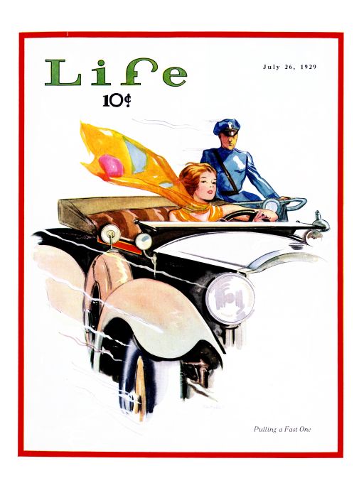 John Holmgren poster of a sexy red haired girl speeding away from a police officer, her yellow scarf blowing up in the wind behind her. Life Magazine cover July 26, 1929.
