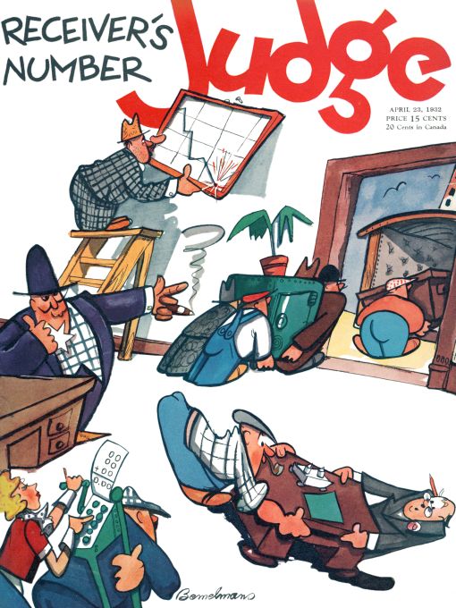 Bemelman poster of a sheriff directing the repossession of a failed businessman's belongings. Judge Cover April 23, 1932.