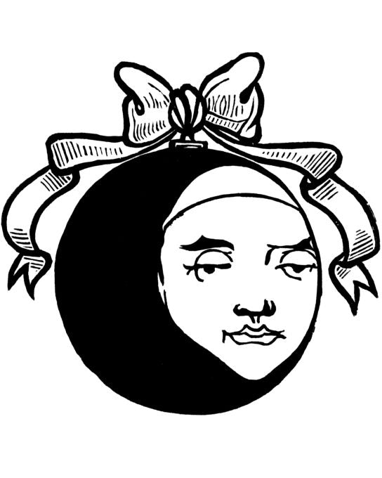 Beardsley illustration of a Christmas ornament with a haunting face on it.
