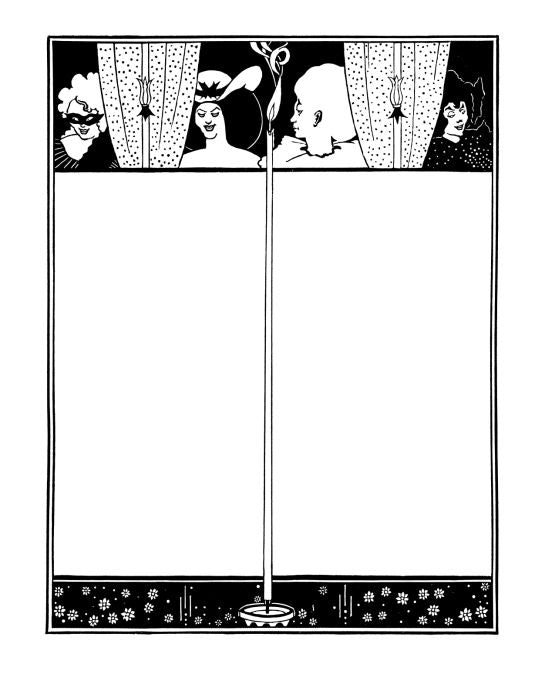 Beardsley illustration of several masked and costumed girls with a big candle coming up through the middle of the page as a divider.
