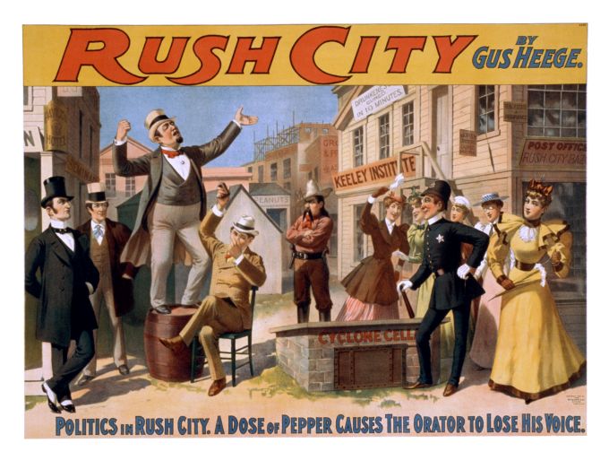 Politician on soapbox with townspeople around reading "Politics in Rush City. A dose of Pepper causes the orator to lose his voice."