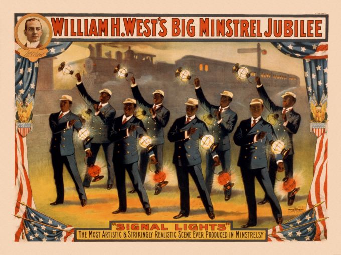 Group of actors at a train station performing with signal lights reading "Signal Lights - The Most Artistic & Strikingly Realistic Scene ever produced in Minstrelsy".