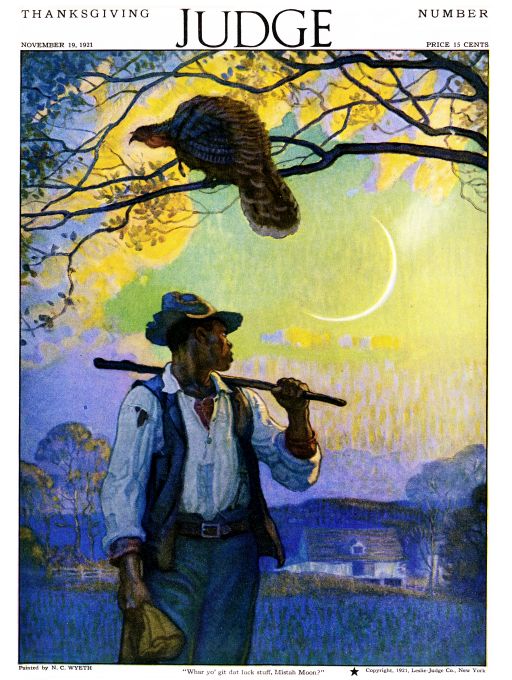 N.C. Wyeth poster of a black man in dusty clothes walking over a field of blue grass, a stick slung over his shoulder, a bag hanging from his other hand, a turkey perched on a branch above him, and a farm behind him. Judge Magazine cover November 19. 1921.