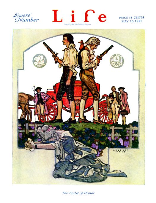 Herbert Paus poster of a distressed girl at her knees before two men standing back to back ready for a duel while several onlookers stand by a horse carriage. Life Magazine cover May 26, 1921.