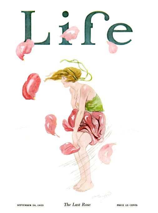 Unknown artist poster of a sexy blonde girl having her skirt blown up in the wind as rose petals fly all around her. Life Magazine cover September 20, 1923.