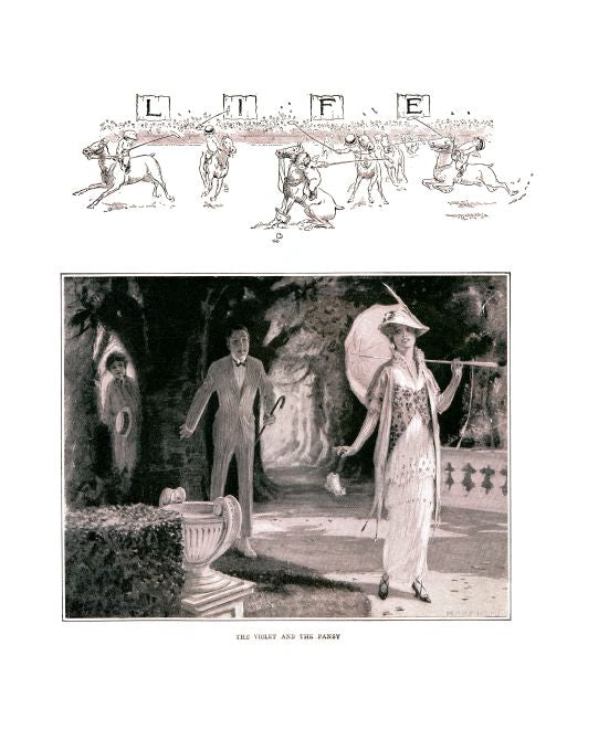 Angus Macdonnel poster of a elegant girl in a dress and umbrella standing with a cold shoulder to a man in a suit with a can who is trying to capture her attention while another girl lurks behind in the tress. Life Magazine cover 1914, date unknown