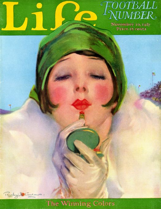 Unknown artist poster of a glamorous girl in a green hat looking in mirror as she applies lipstick. Life Magazine cover November 10, 1927.