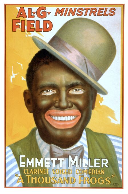 Man in black face reading "Emmett Miller, Clarinet Voiced Comedian, A Thousand Frogs"