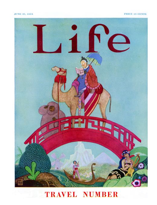 Rea Irvin poster of a man riding a camel over a pink bridge, holding an umbrella, a girl in a skirt and bikini top laying in front of the bridge, a man rowing a boat standing up on the water beneath it. Life Magazine cover June 12, 1924.