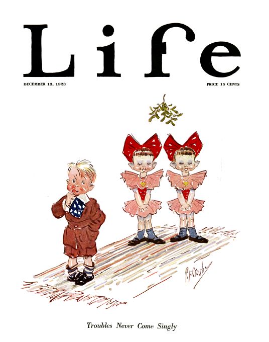P.F. Crosby poster of two little twin girls in red dresses and bows standing admiringly behind a little blond boy picking his nose. Life Magazine cover December 13, 1923.