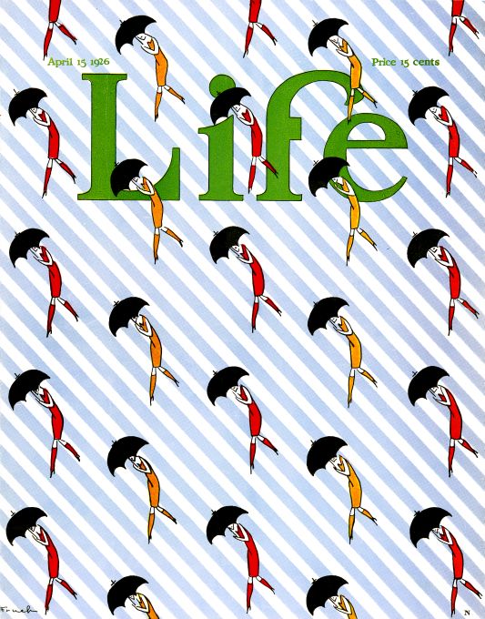 Fruch poster of girls in red and orange dresses holding black umbrellas and positioned in a pattern over a diagonal blue stripped background. Life Magazine cover April 15, 1926.