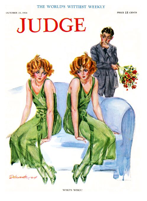Delevante poster of two stunning girls, twins in matching green dresses, sitting on a blue couch, a perplexed man in a suit holding flowers trying to figure out which one is which. Judge Magazine cover October 25, 1924.