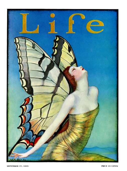 W.T. Benda poster of a beautiful girl in a tight yellow dress which almost looks as though made of bandages, wings jutting out from her back in submission or about to take off. Life Magazine cover September 27, 1923.